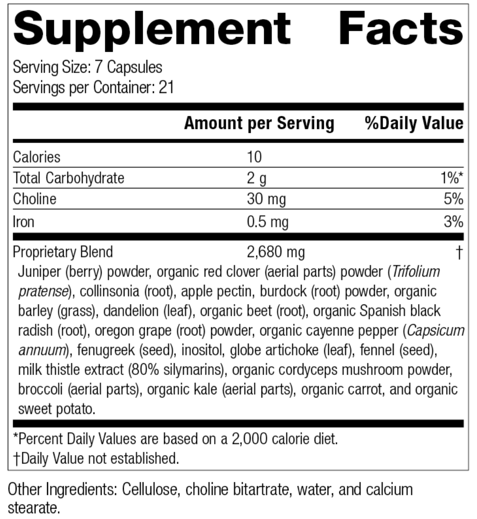 Proprietary Blend 2,680 mg: Juniper (berry) powder, organic red clover (aerial parts) powder (Trifolium pratense), collinsonia (root), apple pectin, burdock (root) powder, organic barley (grass), dandelion (leaf), organic beet (root), organic Spanish black radish (root), Oregon grape (root) powder, organic cayenne pepper (Capsicum annuum), fenugreek (seed), inositol, globe artichoke (leaf), fennel (seed), milk thistle extract (80% silymarins), organic cordyceps mushroom powder, broccoli (aerial parts), organic kale (aerial parts), organic carrot, and organic sweet potato. Other Ingredients: Cellulose, choline bitrate, water, and calcium stearate.